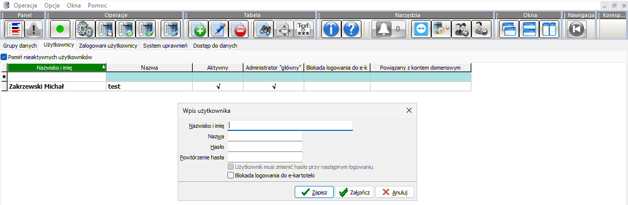 - Nazwisko i imię: nazwisko oraz imię użytkownika.