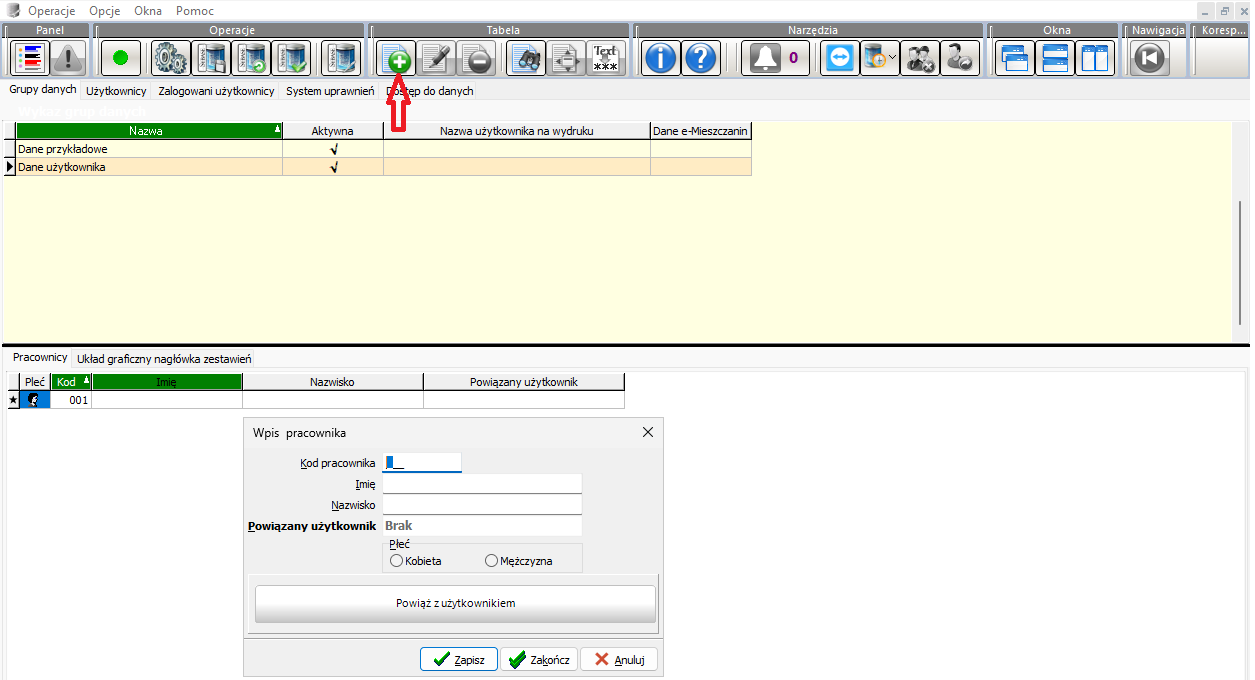 - Po dodaniu użytkownika, konieczne jest jego powiązanie z pracownikiem, aby rozpocząć synchronizację danych. Można to zrobić w zakładce grupa danych, należy tam również wybrać aktualnie używaną grupę danych.