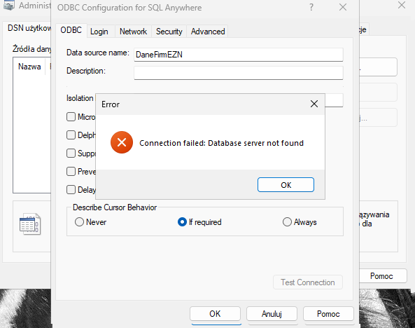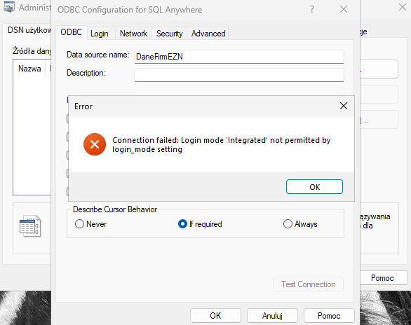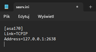 - komunikat o nieprawidłowym użytkowniku lub logowaniu zintegrowanym oznacza prawidłowe skonfigurowanie i wygenerowanie pliku %appdata%\SQL Anywhere 17\sasrv.ini