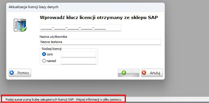 - W oknie należy wpisać klucz otrzymany przy zakupie licencji silnika bazy danych w sklepie SAP Store.